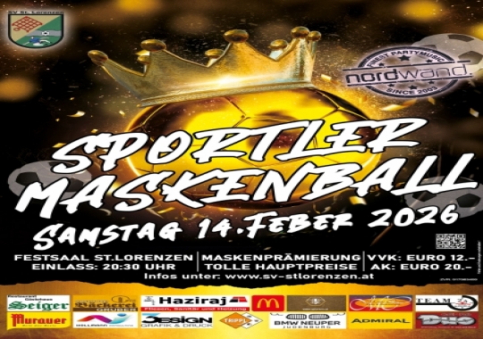 Am SAMSTAG, 14.Feber 2026 mit Beginn um 20:30 Uhr findet wieder der legendäääre Sportlermaskenball im Festsaal in St.Lorenzen bei Knittelfeld...